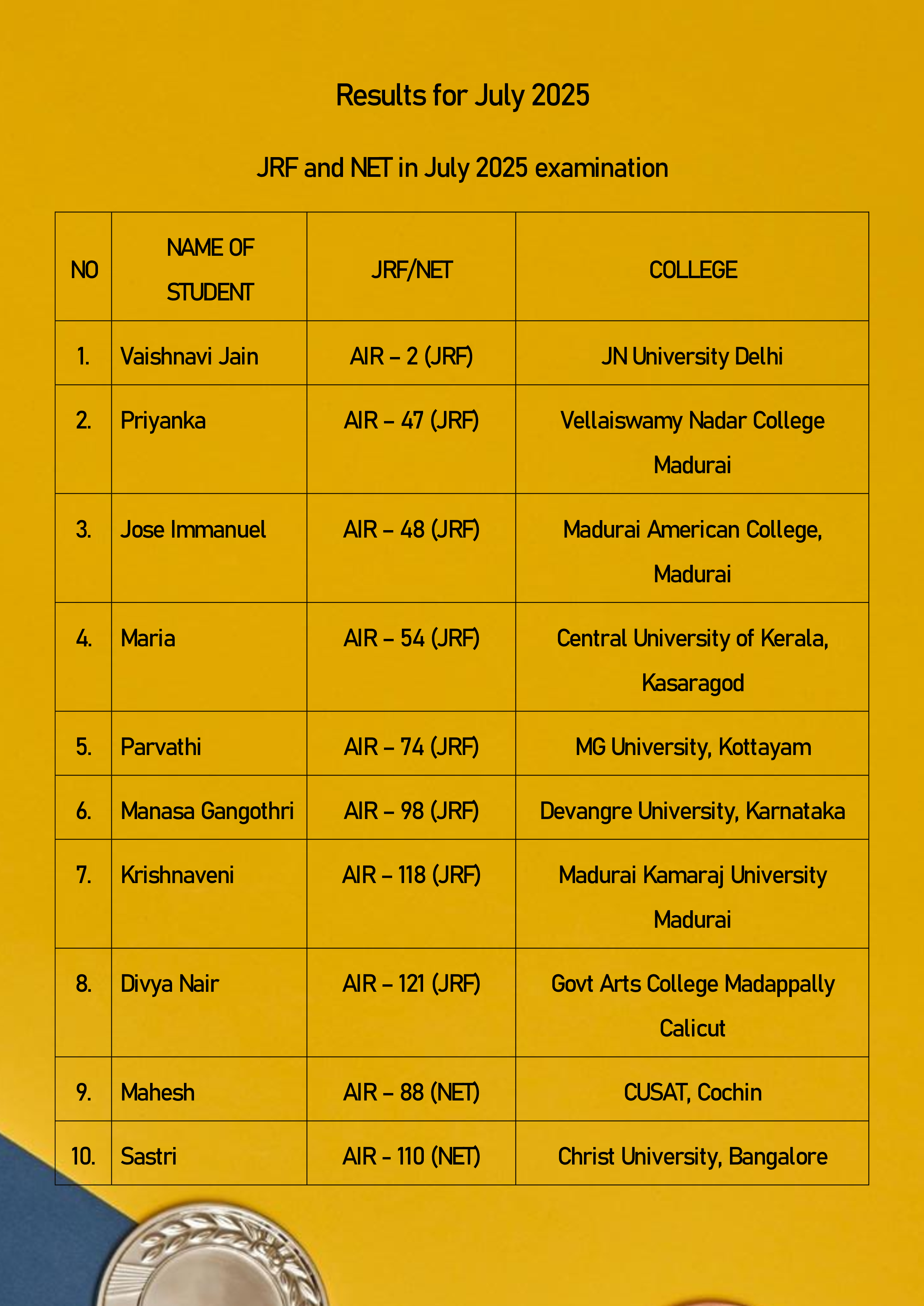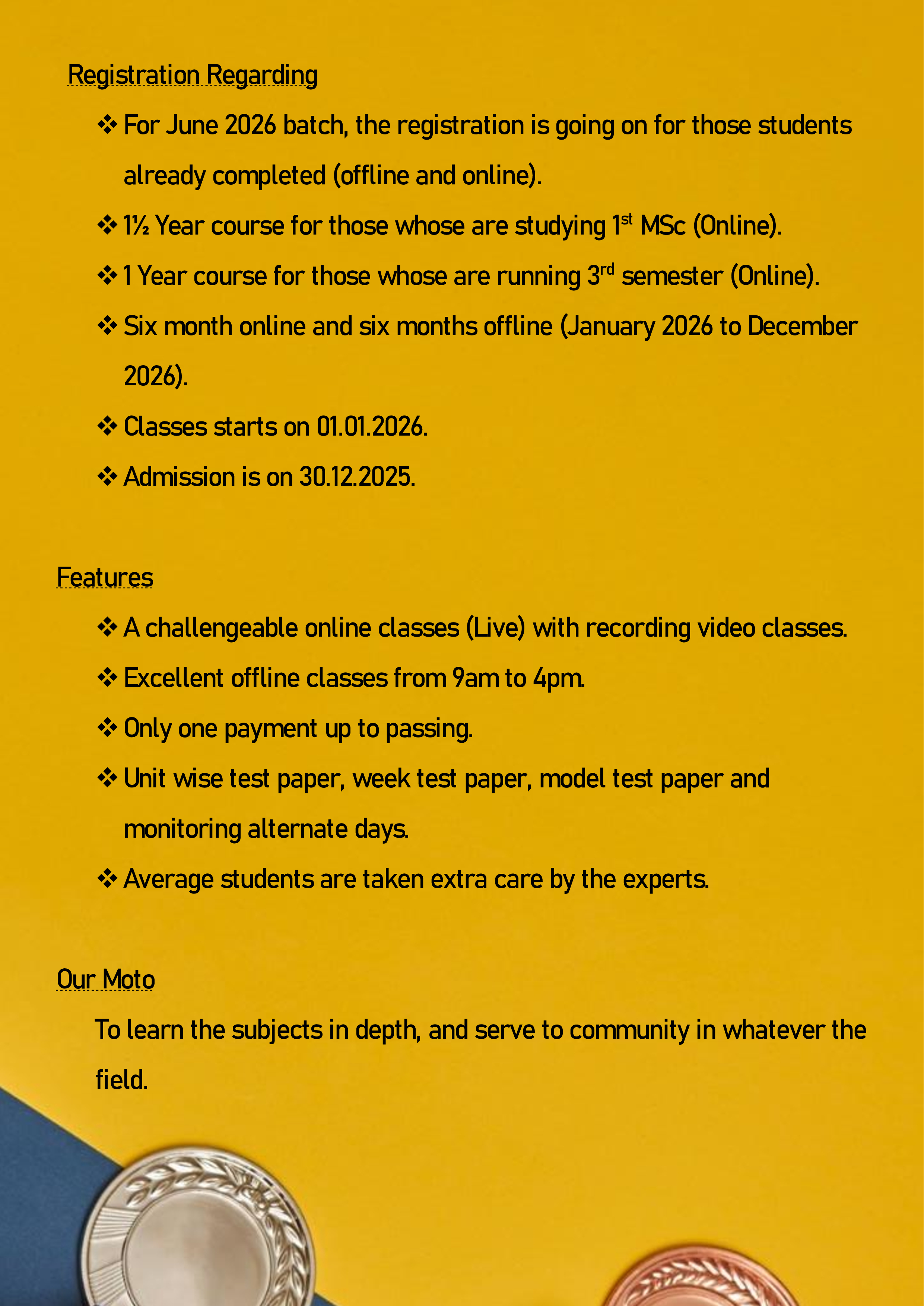We provide exellent training for students who wish to have high performance in JRF/UGC/NET. This systematic, target oriented and most exhaustive learning programme is a unique venture of us. The effective course plant and updated notes as per latest pattern is a method to guarantee success in our target by proper guidance, comprehensive skill and analytical ability.